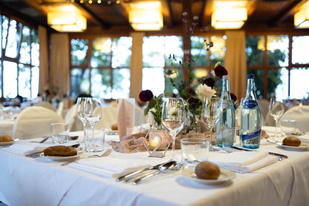 Beim Blumenkonzept blieb es klar und zurückhaltend. Die Farben Burgunderrot und Weiß-Creme haben perfekt zum restlichen Hochzeitskonzept gepasst und sich schön durch den Raum gezogen, ohne zu dominant zu wirken. Statt großer, opulenter Arrangements wurde bewusst auf eine leichtere Blumendeko gesetzt, die den rustikalen Charakter des Saals unterstreicht und nicht überdeckt.
